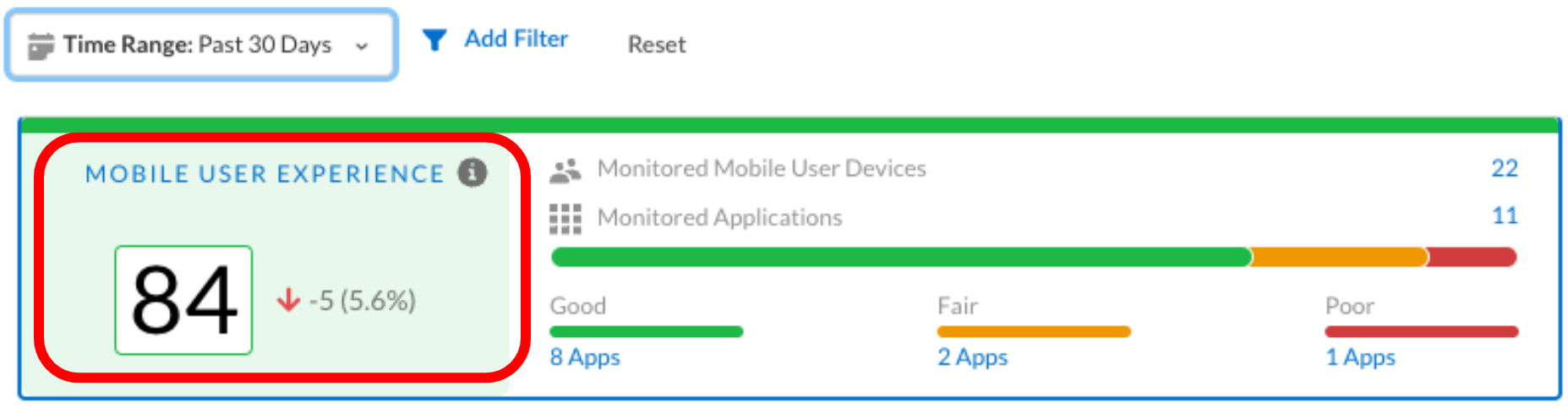 This API retrieves the Mobile Users experience score. The score is aggregated across all the monitored mobile user devices.